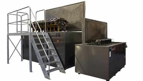 The parts are easily placed in the cleaning tray. The tray is activated pneumatically/hydraulically and can manipulate operation loads up to 2,100 kg or higher.